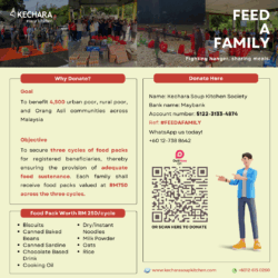 Through this initiative, donors and sponsors help provide three cycles of essential dry food provisions over a six-month period, with each cycle valued at RM250, amounting to RM750 per family. These food packs are carefully planned to meet basic nutritional needs and ease the daily challenges faced by vulnerable households.
